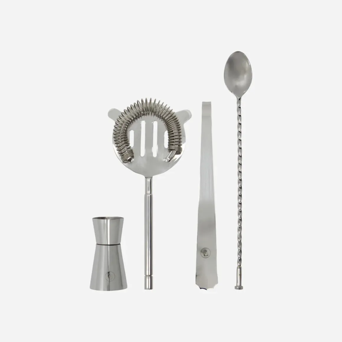 Size: Measuring cup: h: 7 cm, dia L: 4 cm, Stirrer: l: 26.2 cm, w: 3 cm, Strainer: l: 21 cm, w: 9 cm, Ice cube tong: l: 20 cm, w: 2.5 cm, h: 6 cm