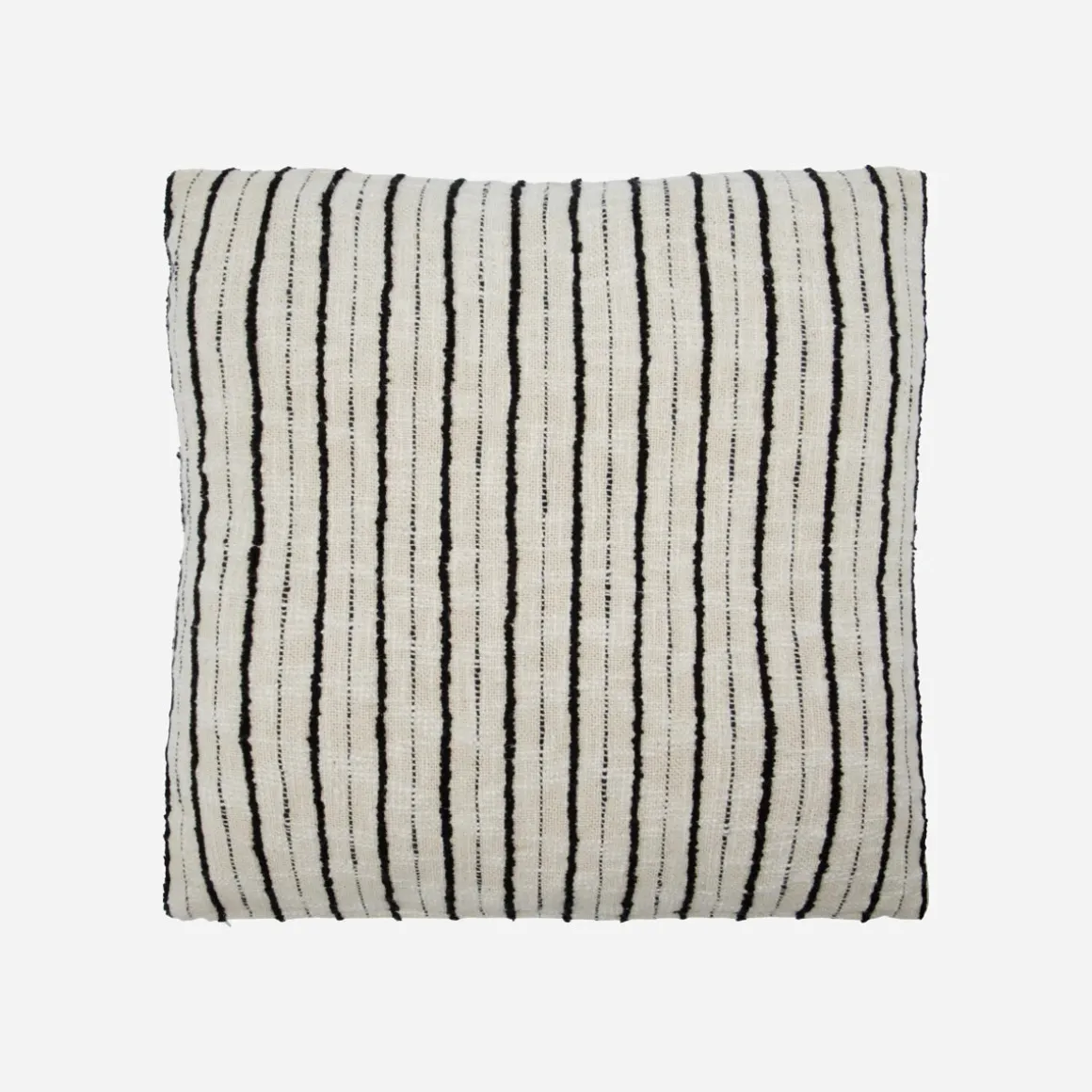 Feine schwarze Streifen auf weicher Baumwolle sorgen für einen zeitlosen Look, der sich vielseitig mit anderen Dekokissen kombinieren lässt. Die angenehme Textur und das dezente Muster schaffen einladende Gemütlichkeit – egal ob im Lesesessel, auf dem Bett oder als entspannter Akzent im Lounge–Bereich.– Handgewebtes Unikat.