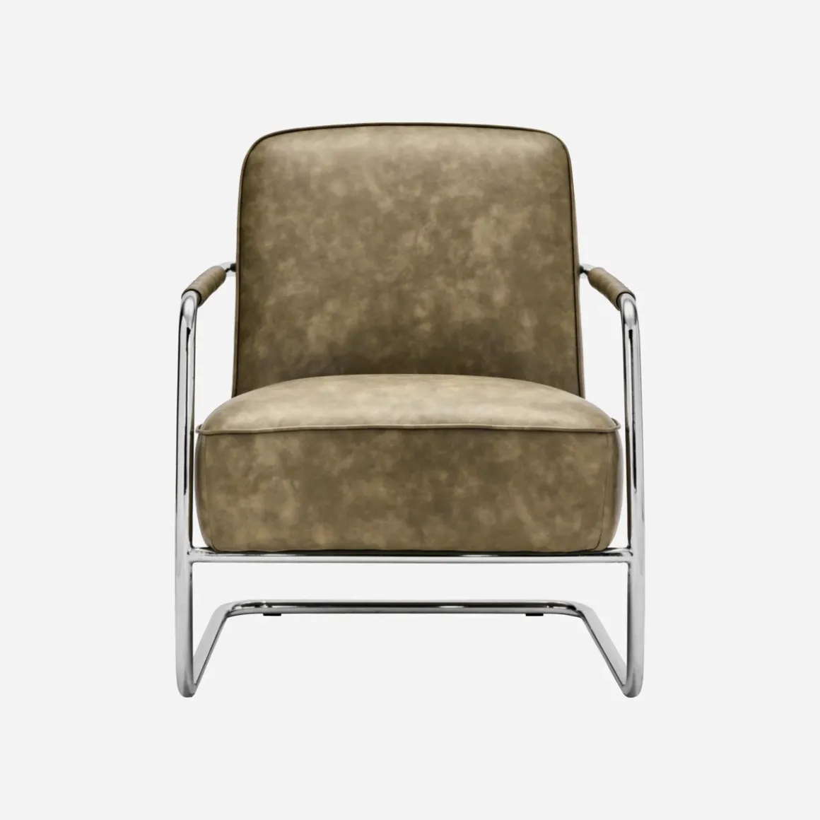 Das khakifarbene Lederlook-Polster sorgt für luxuriösen Sitzkomfort und das gebogene Chromgestell ist ein echtes Design-Highlight, das das leichte, schwebende Aussehen unterstreicht.