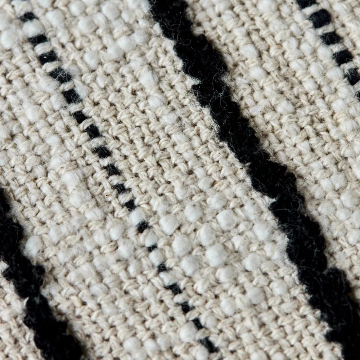 Feine schwarze Streifen auf weicher Baumwolle sorgen für einen zeitlosen Look, der sich vielseitig mit anderen Dekokissen kombinieren lässt. Die angenehme Textur und das dezente Muster schaffen einladende Gemütlichkeit – egal ob im Lesesessel, auf dem Bett oder als entspannter Akzent im Lounge–Bereich.– Handgewebtes Unikat.